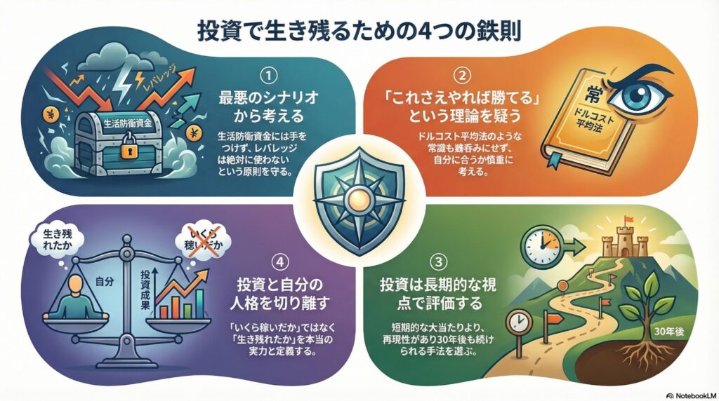 説明:投資の失敗が、本業・家族・精神を破壊する経路を遮断する。